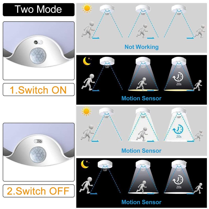 - 【Two modes available】There is a switch nearby the motion sensor, slide the switch to turn on/shut off the photocell sensor. When it is ON, the closet lights will keep off under daytime and only could be motivated on at night; when it is OFF, the light could be motivated on all day long.