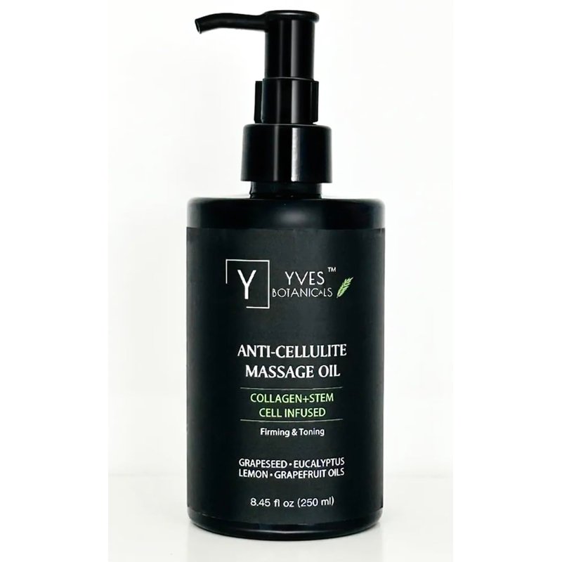 Rejuvenate skin with Anti-Cellulite Massage Oil formulated by Yves Botanicals. Collegen and Stem Cell infused, enriched with essential botanical oils, organic extracts and antioxidants. Contains Eucalyptus, Grapeeseed, Lemon, Grapefruit, Jojoba and Sunflower essential oils contributing to regenerating, moisturing and skin toning properties for visibly hydrated, supple and nourished skin