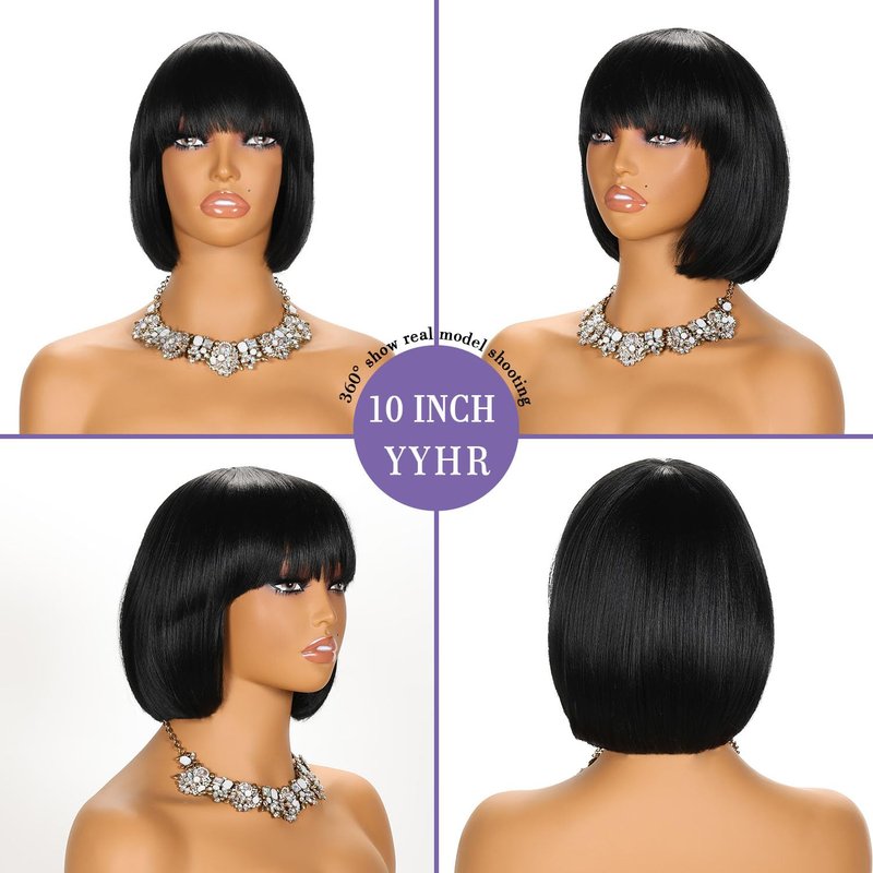 YYHR Short Bob Wig With Bangs 10" Light Yaki Straight Synthetic Hair Wigs Cut Short Black Bob Wigs With Bangs Daily Costume Wig Hair Replacement Wigs Heat Resistant (10 Inch,1B)
