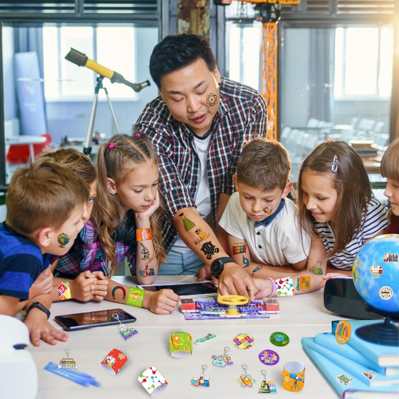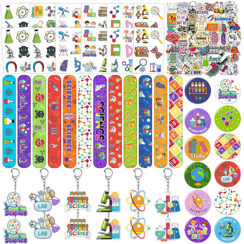 when you plan an science birthday party or baby shower, there are enough science-themed tattoo stickers to share with your classmates and friends; the science-themed snap bracelets have bright colors and interesting patterns, and children will definitely like them.colorful keychain sets can be attached to the bags, keys and other things.