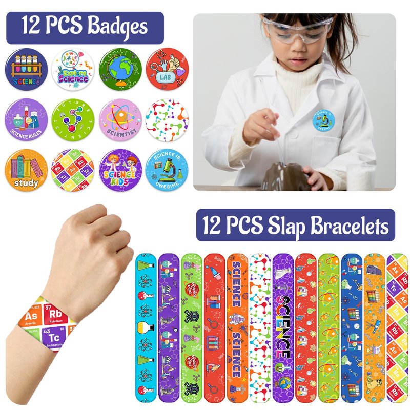- 【Science Party Favors】: Science birthday party favors contains 12 science slap Bracelets,12 science button pins, 12 science key chains, 50 science Stickers and 12 sheet science temporary tattoos, designed to be science theme, with a variety of different patterns including test tubes, beakers and microscopes, magnets, chemical reactions, caution signs, elements, compounds, DNA +,etc.