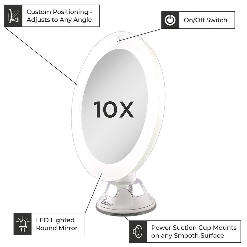 Zadro LED Lighted 10X Magnification Z'Swivel Power Suction Cup Vanity Wall Mount Beauty Makeup Mirror, White