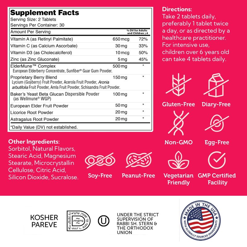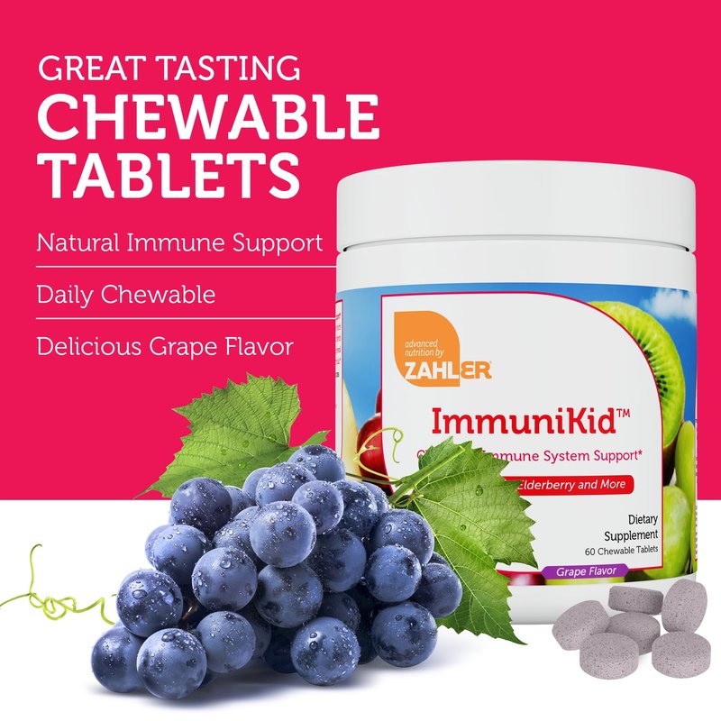 - KID-FRIENDLY IMMUNE SUPPORT - ImmuniKid includes a combination of kids immunity vitamins for kids immune support (Vitamin A, C, D3) plus a supercharged blend of essential wellness nutrients like Zinc and Elderberry, all in a tasty grape-flavored chewable tablet.
