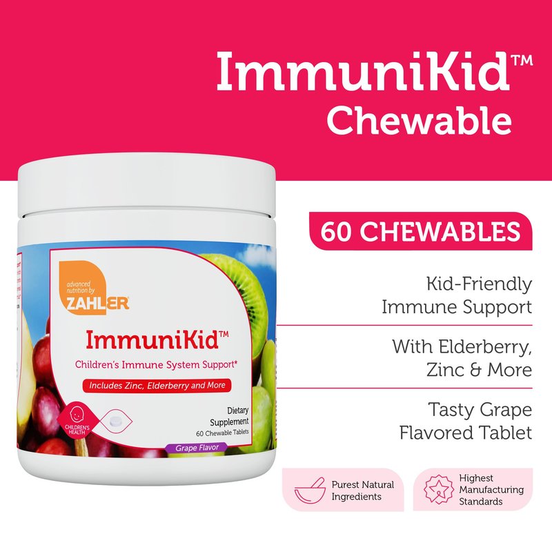 Zahler’s ImmuniKid is a specially designed immune support supplement for children, blending essential vitamins and herbal ingredients to support a robust defense system in growing bodies. This grape-flavored chewable tablet makes daily supplementation easy and enjoyable for kids ages 4 and up.