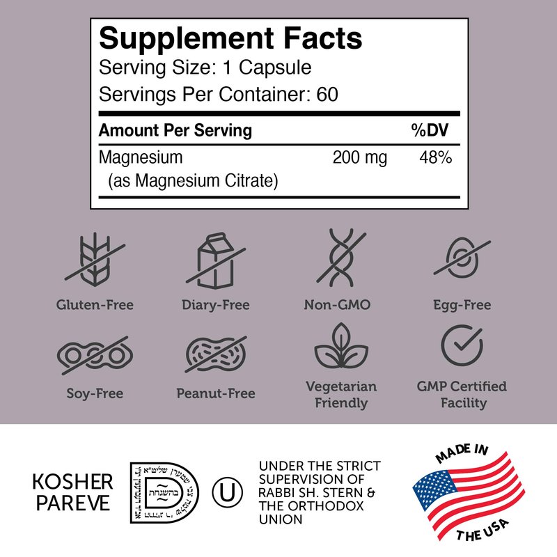 Zahler - Magnesium Supplement Capsules 200 mg (60 Count) Certified Kosher Bioactive Magnesium Citrate for Max Absorption - Natural Magnesium Mineral for Men & Women - Best Magnesium Supplements