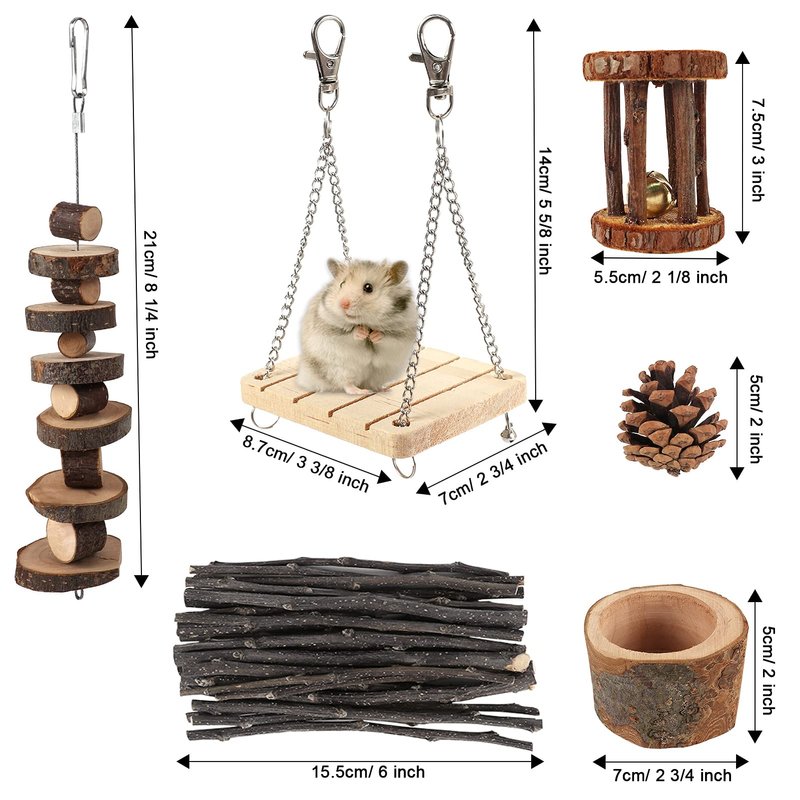 - 🐹17 PACK WOODEN ACCESSORIES: Including wooden house, bell roller, bell swing, molar string, wooden food bowl, seesaw, pine cone, apple wood sticks, total 17 pack hamster accessories.