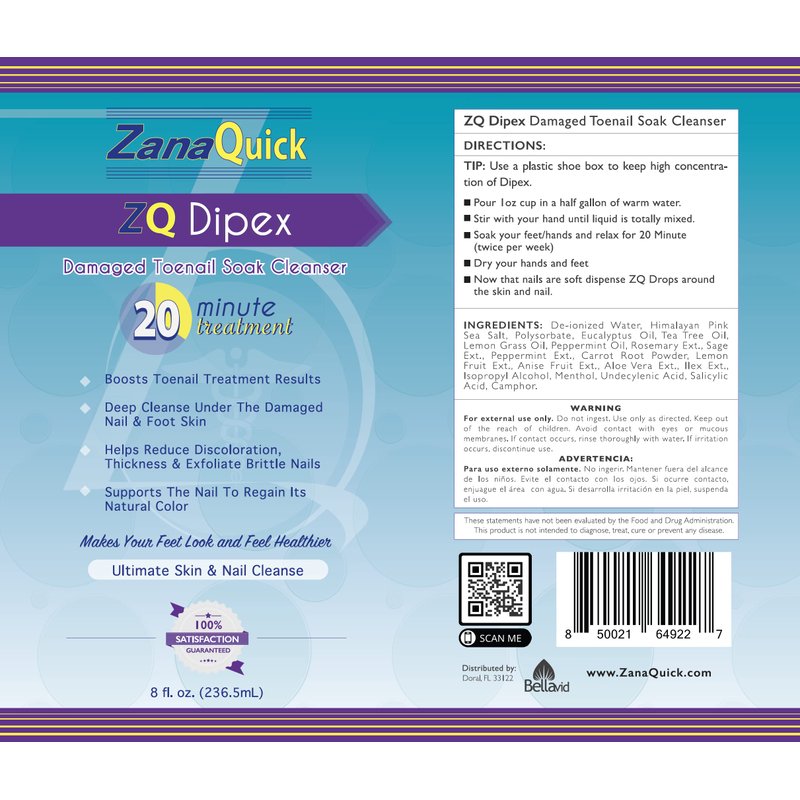 POUR 1oz CUP IN A GALLON OF WARM WATER Stir with your hand until liquid is totally mixed. Soak your feet/hands and relax for 20 minutes (twice per week) Use a small narrow container (plastic shoe box) to keep high concentration of Dipex Rinse off and dry your hands and feet. Now that your nails are soft, dispense ZQ Drops around the skin and nail.