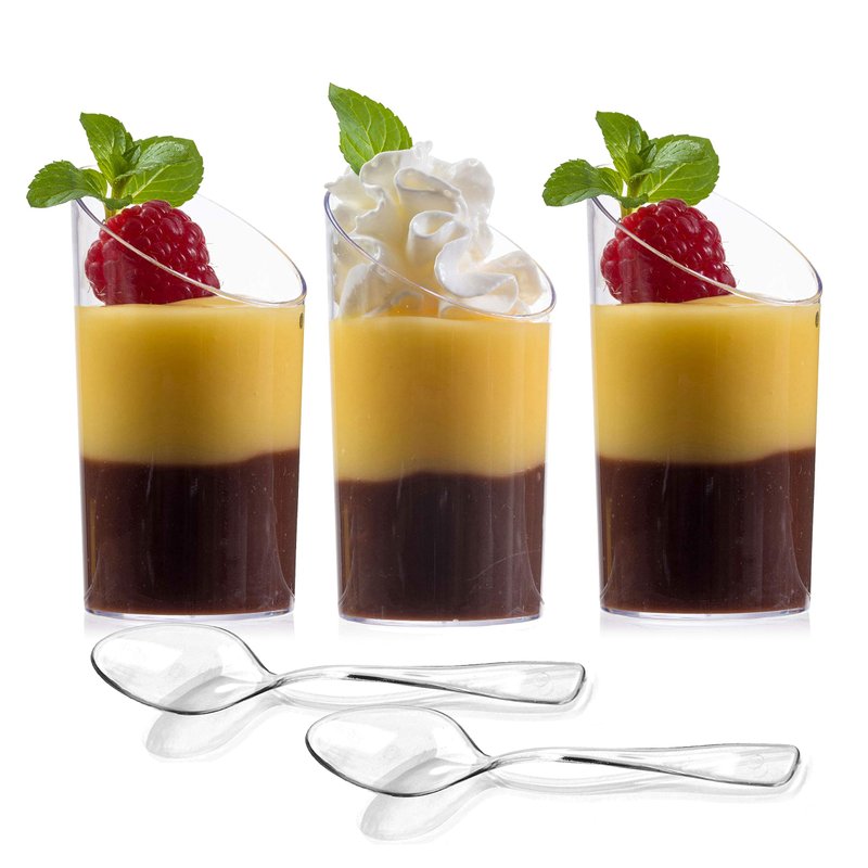 - THE BEST PARTY STUFF When searching for elegant Party Tableware these are the perfect Disposable Cups, Shot Cups, Plastic Drinking Cups use as Plastic Shot Glasses or Individual Dessert Cups with Matching Dessert Spoon These are sure to delight every Party Planner, Caterer, and Guest out there Showcase layered desserts, parfaits, mousses, trifle, jello shots, pudding, appetizers, fruit salads, hors d'oeuvres, in these Tall Dessert Disposable Plastic Cups Small Tumblers