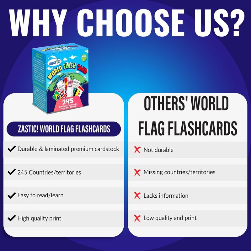 - Gift-Worthy Packaging: Zastic!'s Geography Flashcards come in an attractive packaging box, making our Country Flashcards an excellent gift for friends, family, or educators passionate about geography and learning about world flags.