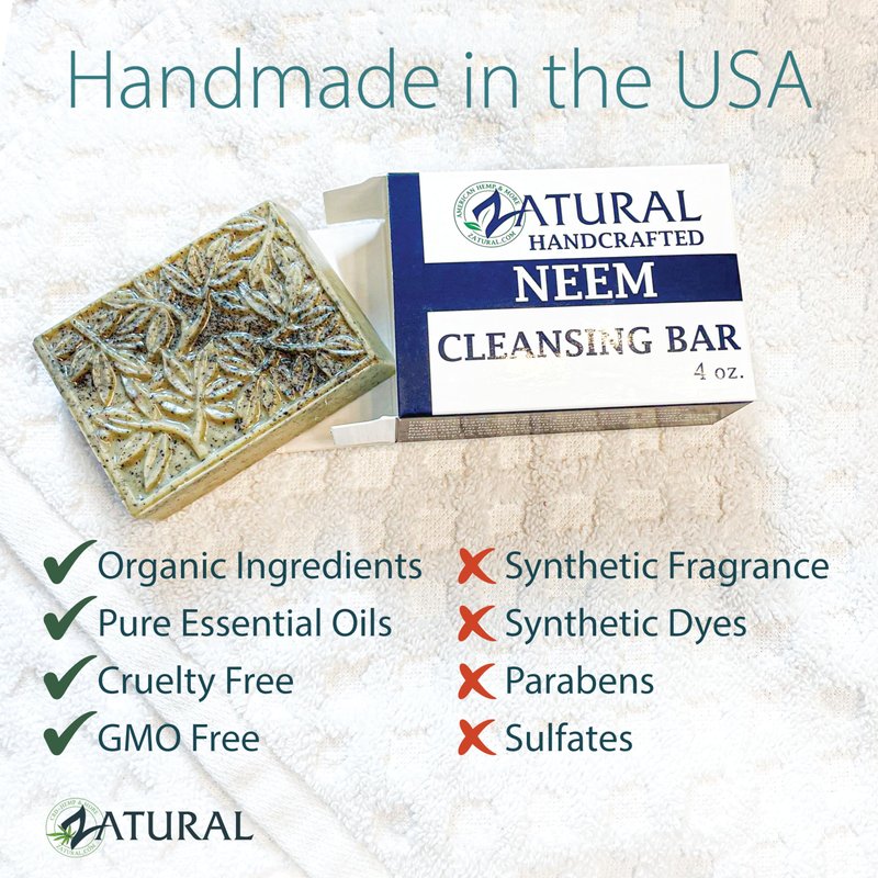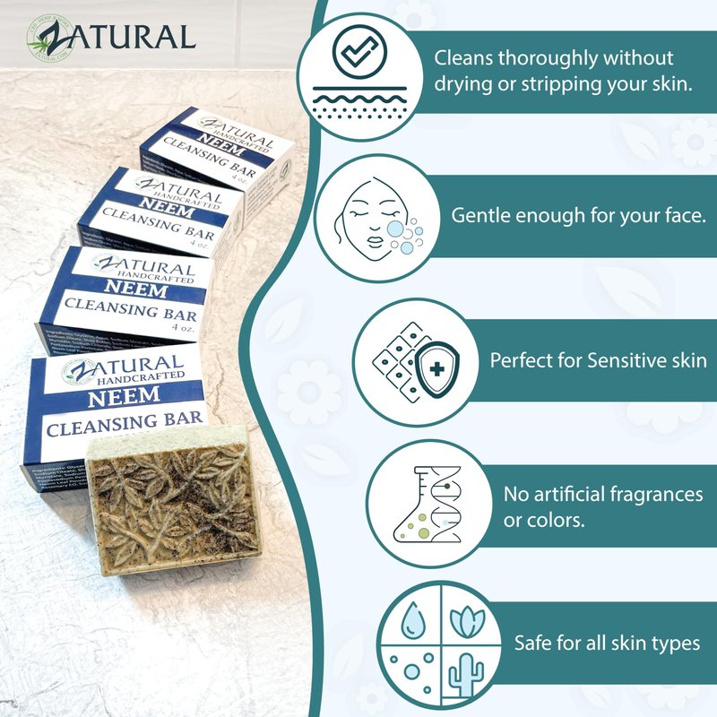 Maximum Strength For Sensitive Skin This the most concentrated organic neem bar available. Shea Butter Base for added soothing therapy NO Parabens NO SLS NO Gluten NO Petrochemicals NO Phthalates NO Synthetic Ingredients NO Fragrance Vegan Kosher Non-GMO Ingredients 82% Organic The neem tree is known as “the miracle tree” Botanical Name: Azadirachta indica Packed with antioxidants, Neem can help protect and moisturize even the most sensitive skin. Safe for all ages pH balanced and conditioning Assists dry skin, itching, skin irritation. Hand-crafted with only the finest-quality organic oils and other all-natural ingredients. Variation in color may occur. Green spots are the organic neem leaf.