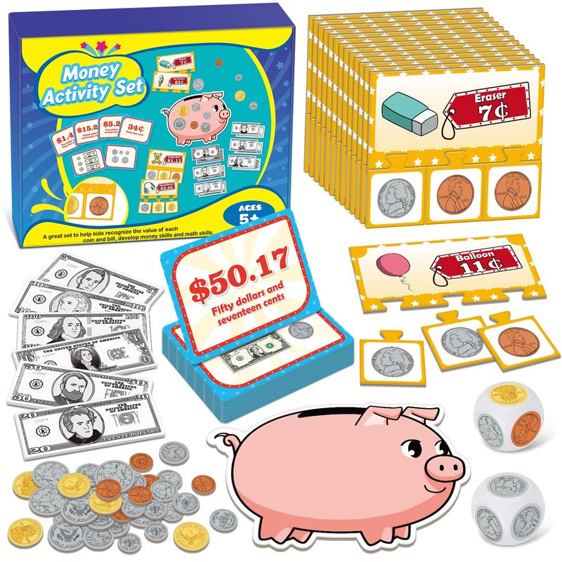 - Complete Money Activity Set: Our money learning set includes 60 play bills, 60 play coins, 24 puzzle cards, 12 double-sided price tags, a piggy bank card, 2 dice, and a guide
