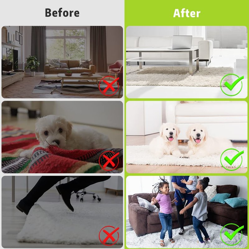 - Anti Curling Non Sliding - Are you fed up of sliding rugs or rug corners interfere when you walking? Are you worry about that the elderly and kids tripping over rug edges, pets playing with area rugs? These adhesive rug stickers can fix all these problems immediately. It has strong stickiness that can hold the carpet flat and keep it in place firmly.