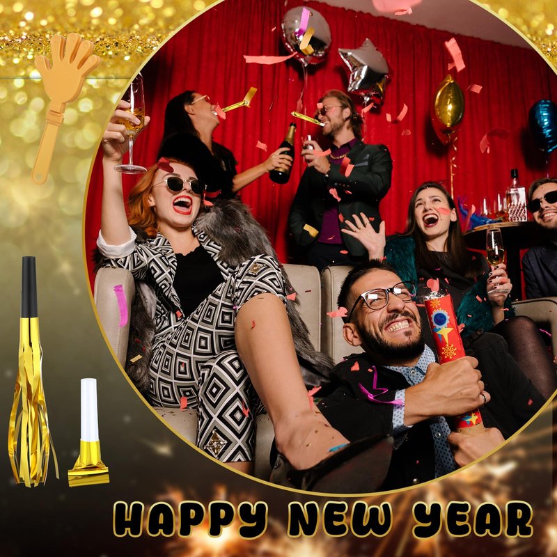 - Exquisite Design for Festive: Happy New Year Noisemakers come in vibrant gold colors, great for setting the mood for celebration, with their cute and sophisticated appearance, are great accessories for New Year parties; Setting up a refined backdrop for your New Year's celebrations