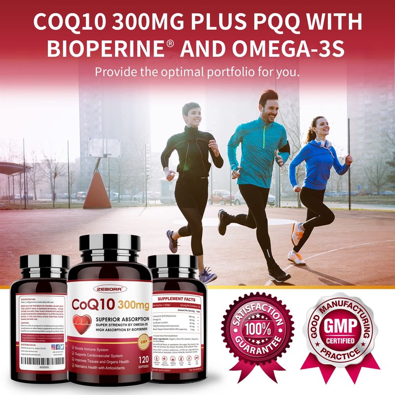 ZEBORA CoQ10-300mg-Softgels with PQQ, BioPerine & Omega-3, 120 Servings Coenzyme Q10 (Ubiquinone) Supplement for High-Absorption, Powerful-Antioxidant, Support Heart-Health & Energy-Production