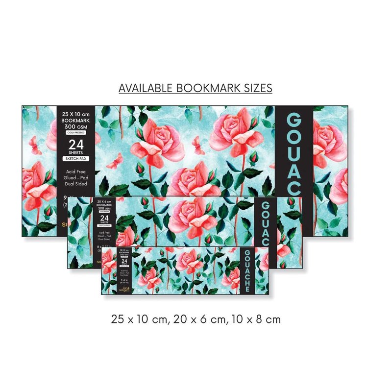- A Glued Sketchpad with 24 Sheets of Bookmark Size (18x5cm) 300 GSM Cold Pressed Gouache Paper.