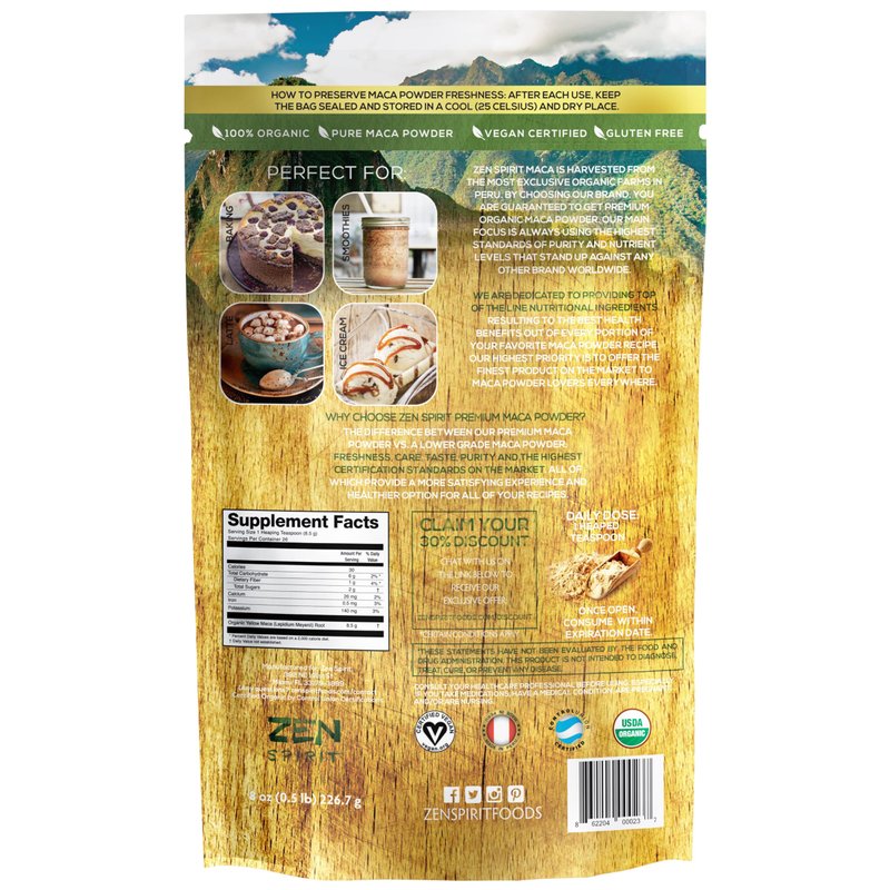 Zen Spirit Maca Powder is the best way to start your day full of energy, mental clarity and it is loaded with organic nutrients. Our Maca Powder is considered Premium Grade because of it’s freshness, care, taste and purity comply with the highest certification standards on the market. Providing a much better Experience and Healthier Option for each of our customers.