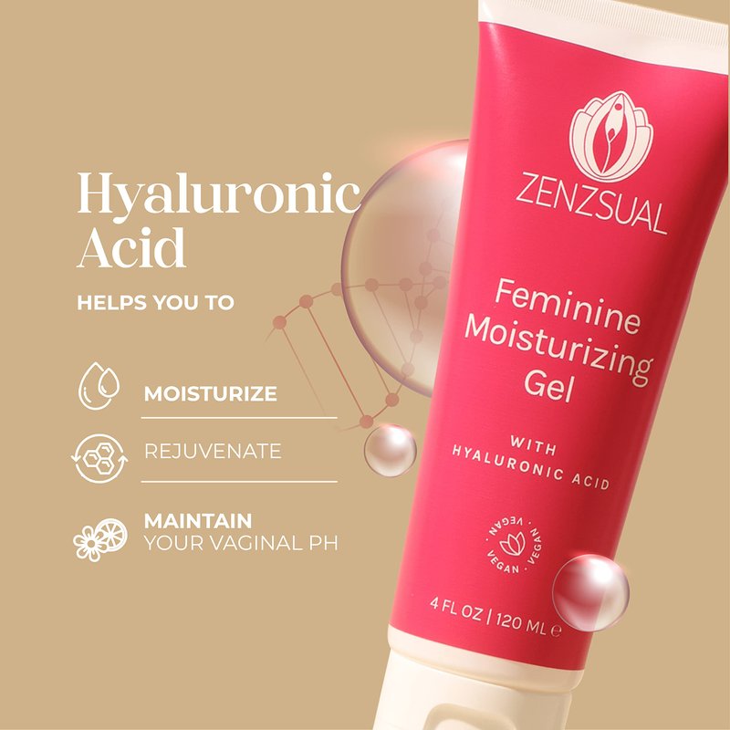 - FEMININE GEL W/ HYALURONIC ACID BY ZENZSUAL – Helps to maintain vaginal PH, Hydrated, replenish and rejuvenate your vagina. Prevents vaginal dryness.