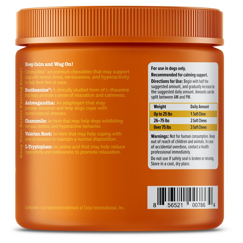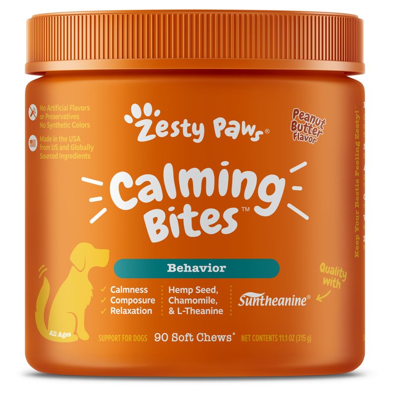 Zesty Paws Calming Bites are premium chewables that aid dogs with normal stress, nervousness, and hyperactivity to help them stay calm and at ease. This functional dog supplement features Suntheanine, an advanced form of LTheanine along with Ashwagandha. Together, these ingredients help support relaxation and calmness for your canine pet. Plus, these soft chews also include Chamomile, Valerian Root, and L-Tryptophan for additional support to keep your pup calm and relaxed Best of all, pets love the delicious taste (trust us, we have a hot spot where official four-legged testers tell us) that’ll give your canine companion an itch for more. Also, pet moms and dads can treat themselves to a sigh of relief knowing that their doggy will maintain composure to keep them feeling too cool for thunderstorms, separation, every day anxiety, fireworks, car rides and travel, and other moments of normal stress.