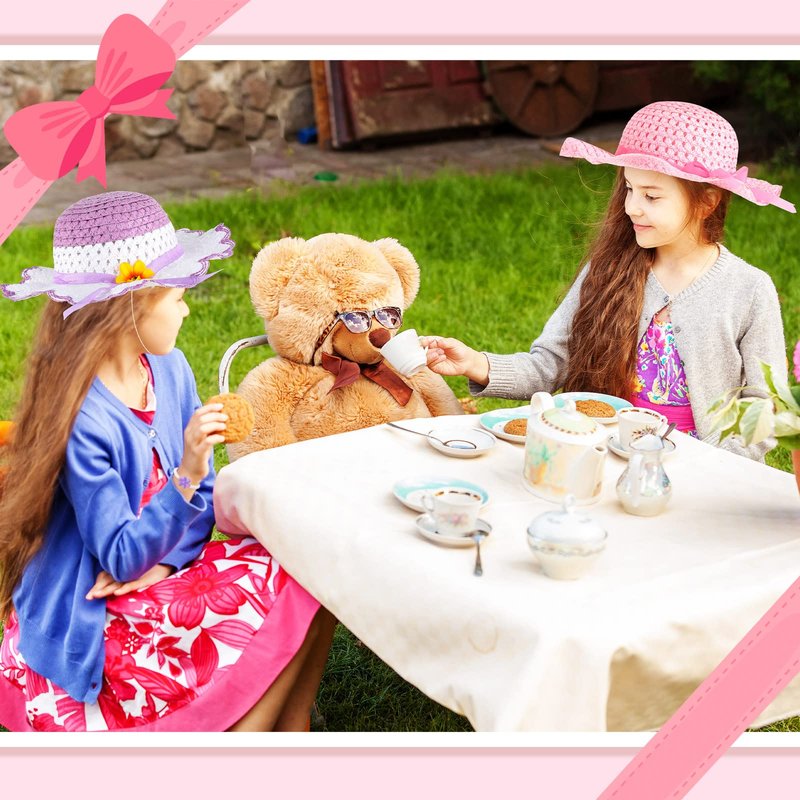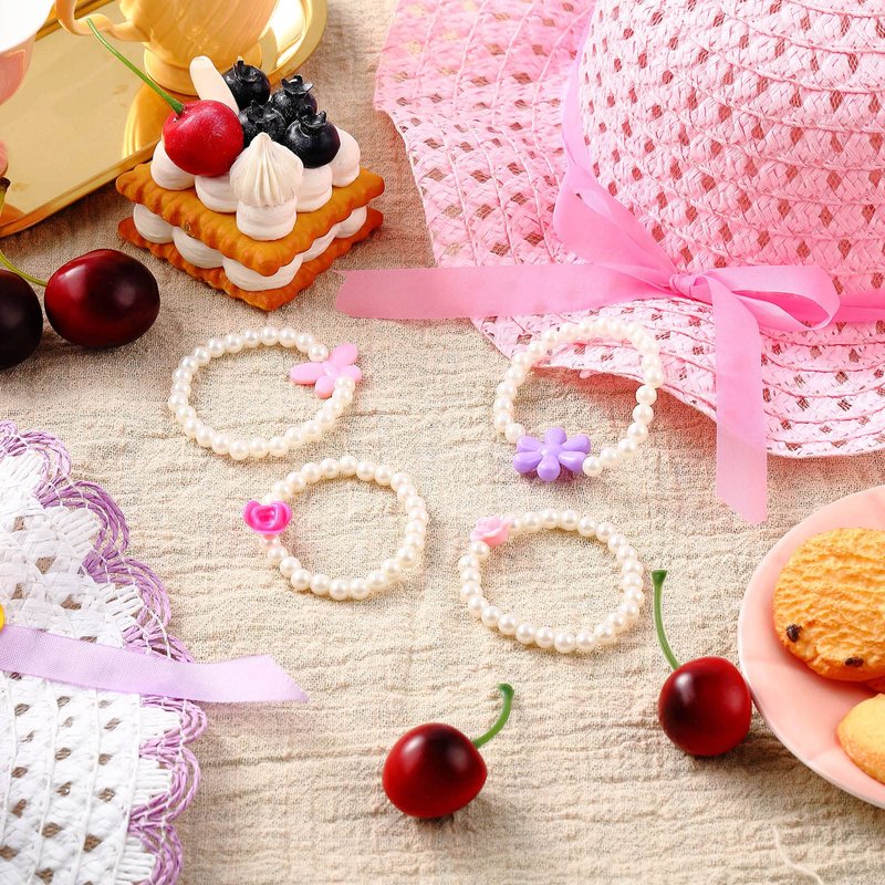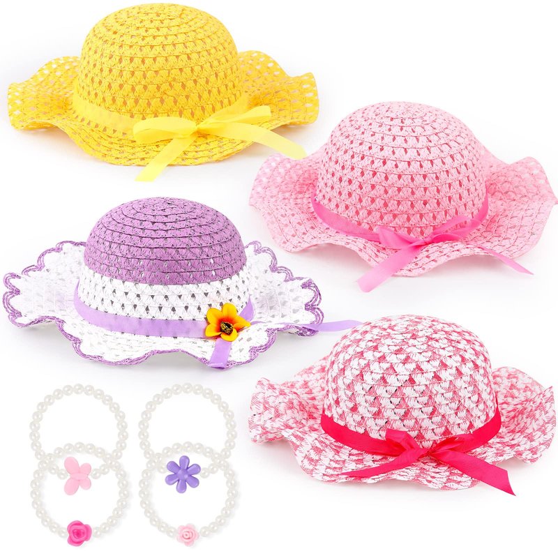 Zhanmai 4 Pcs Christmas Girl Tea Party Hats Straw Hat for Girls Sun Dress up Hats for Kids Toddlers with 4 Pcs Pearl Bracelets for Children Costume Birthday Party Supplies Christmas Beach Travel Gifts