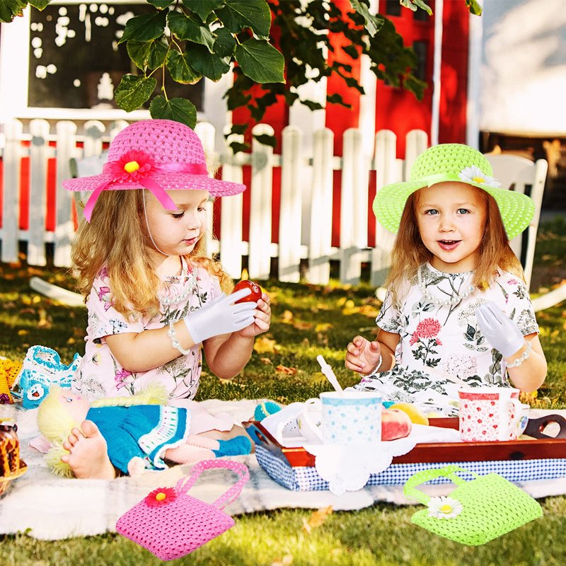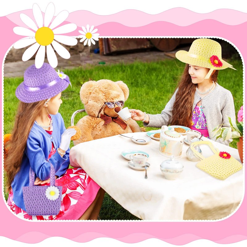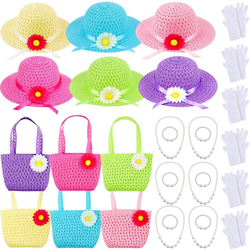 Zhanmai 6 Sets Girls Tea Party Dress Play Set Includes 6 Daisy Tea Party Hats, 6 Straw Purse, 6 Pairs Gloves, 6 Pearl Necklace Bracelet Set for Girls Princess Tea Party Birthday Party Supplies