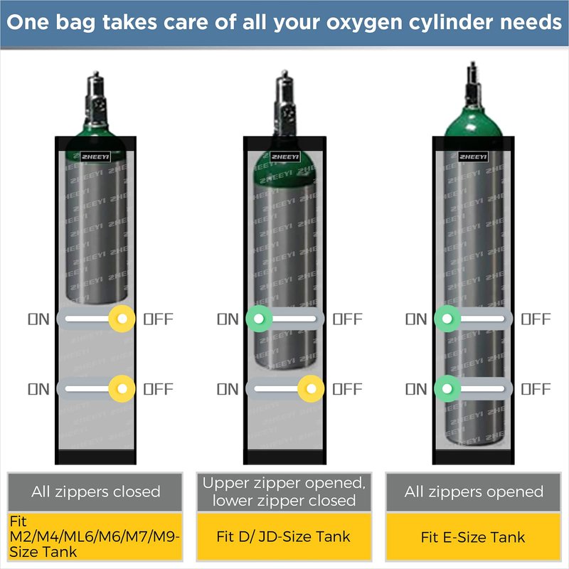 - NEED A BAG THAT FITS MULTIPLE OXYGEN BOTTLE SIZES? Unlike all those cheap oxygen cylinder bags, we have two mysterious "zippers" built in. This approach can be adapted not only to long oxygen cylinders, but also to short oxygen cylinders. Therefore, you only need to buy a bag, can adapt to a variety of sizes oxygen cylinder.