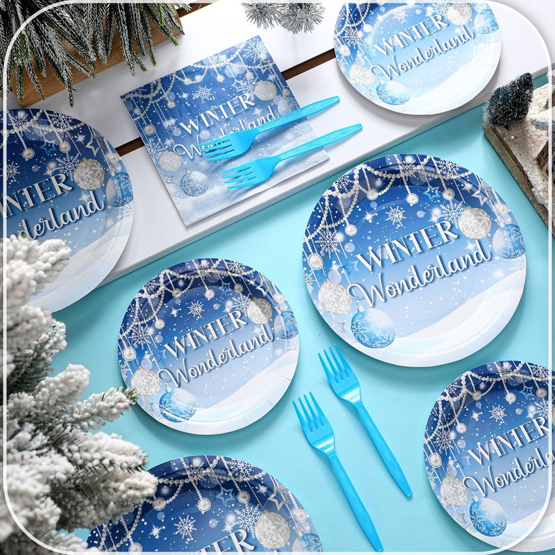 - More Time to Happy: spend more time enjoying your party with our winter wonderland tableware; Designed with convenience in mind, this disposable set of cutlery and dishes makes cleaning up easy; After all the fun, gather set and toss them in the trash