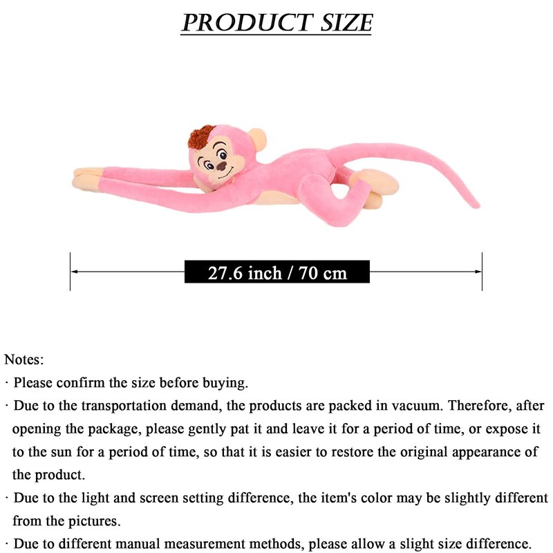 - 【Product Packaging】: The product includes a pink hanging monkey stuffed animal, with a total length of 27.6 inches (70 cm) (from hand to tail). Due to transportation reasons, the product is packaged in a vacuum. Therefore, after opening the packaging, please gently tap and let it stand for a period of time, or expose it to sunlight for a period of time, which is easier to restore the original cuteness of the product.