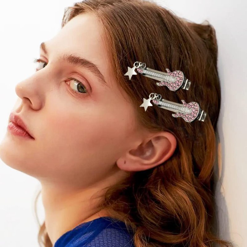 ZHOUMEIWENSP Y2k Metal Hair Clips Retro Rhinestone Guitar Hairpin with Punk Clips Novelty Hair Style Making (Pink)