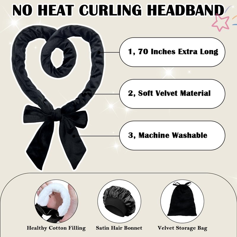 - BEST GIFT: Non heat curling set includes 9 pieces: 1 velvet curling headband (70 inches long), 1 hair clip, 2 velour hair ties, 2 elastic hair ties, 1 satin hair bonnet, 1 velour storage bag, and 1 spray bottle. All sets are packaged in a beautiful gift box, you can achieve beautiful curly hair anytime. This is also a perfect gift for family, friends and colleagues. This way, they can also have natural and amazing curly hair.