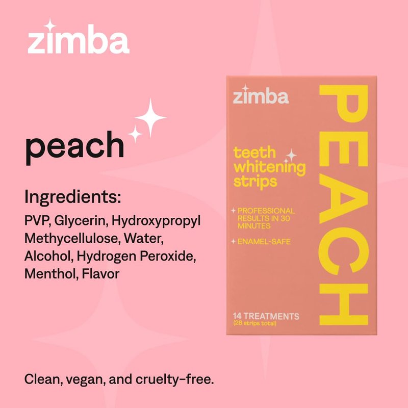 - Color: Zimba Teeth Whitening Strips Vegan Whitening Strip Enamel Safe Teeth Whitening Hydrogen Peroxide Teeth Whitener for Coffee, Wine, and Other Stains, 28 Strips (14 Day Treatment), Peach