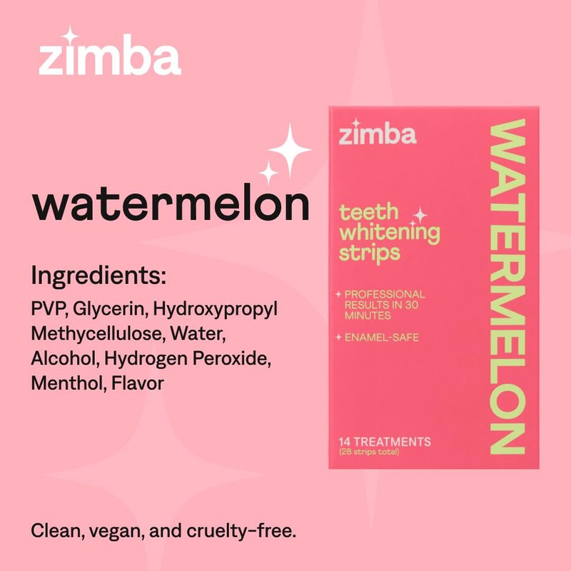 - Color: Zimba Watermelon Flavored Teeth Whitening Strips | Vegan, Enamel Safe Hydrogen Peroxide Teeth Whitener for Coffee, Wine, Tobacco, and Other Stains | 14 Day Treatment | Watermelon
