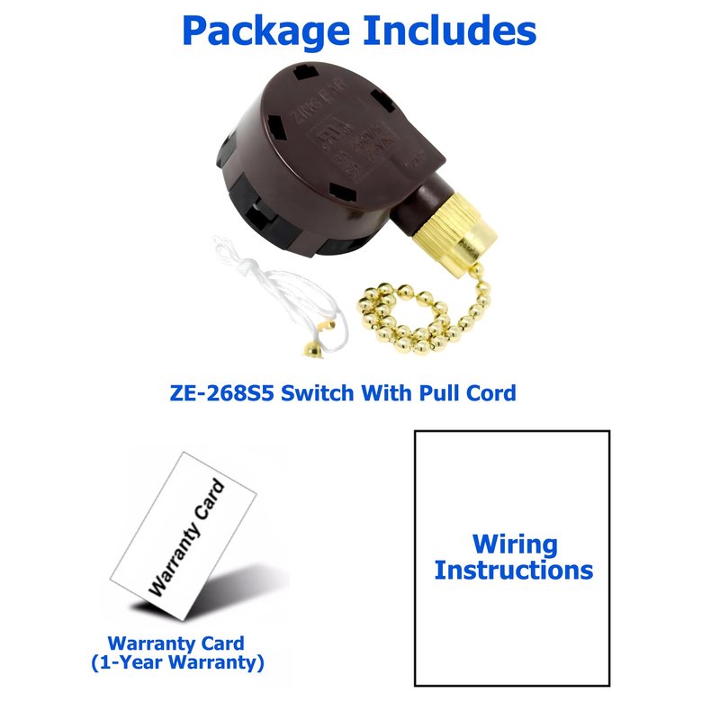 - Package Contents: 1x ceiling fan switch kit Zing Ear ZE-268S5, 3ft pull cord, wiring instructions, and warranty card (1 year warranty on parts)