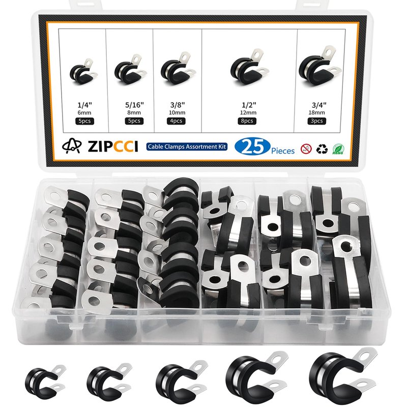 ZIPCCI Cable Clamps Assortment Kit, 25 Pack Stainless Steel Rubber Cushion Pipe Clips (1/4'' 5/16'' 3/8'' 1/2'' 5/8'' 3/4'' inch)