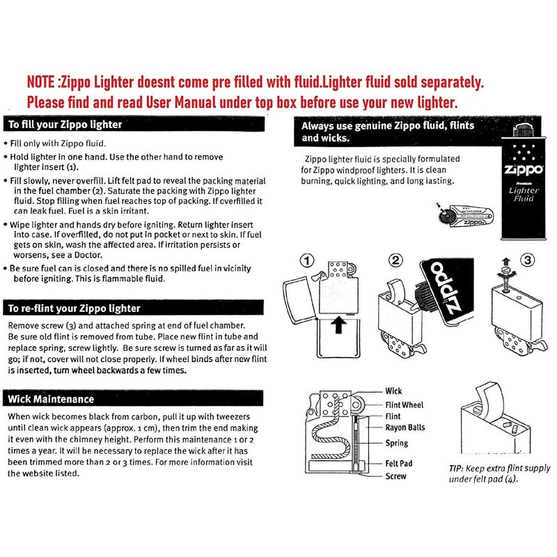 - Due to carrier shipping regulations, Zippo windproof lighters are shipped without lighter fluid. To use your Zippo lighter, fill with Zippo lighter fluid (sold separately).