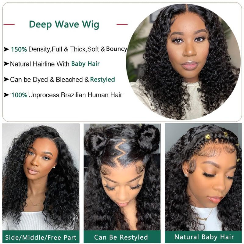 - 【💖Deep Wave Wig Material】10A great quality 100% unprocessed brazilian virgin human hair 13x4 deep wave lace front wigs for women, 150% density wigs human hair, which are soft,healthy,shiny and smooth.