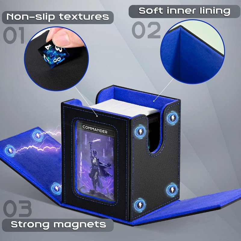 ZLCA MTG Deck Box with Commander Window Display, Trading Card Storage Box Holds 100 Double-Sleeved Cards Suitable for TCG/CCG/PTCG/EDH/Magic/Sport Cards (Black&Blue)