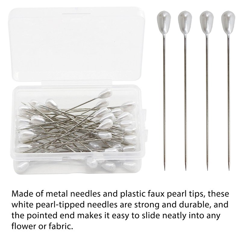 - Made of stainless steel metal pins and plastic faux pearls, this white pearl head pin is strong and durable, and the tip slips easily and neatly into any flower or fabric.