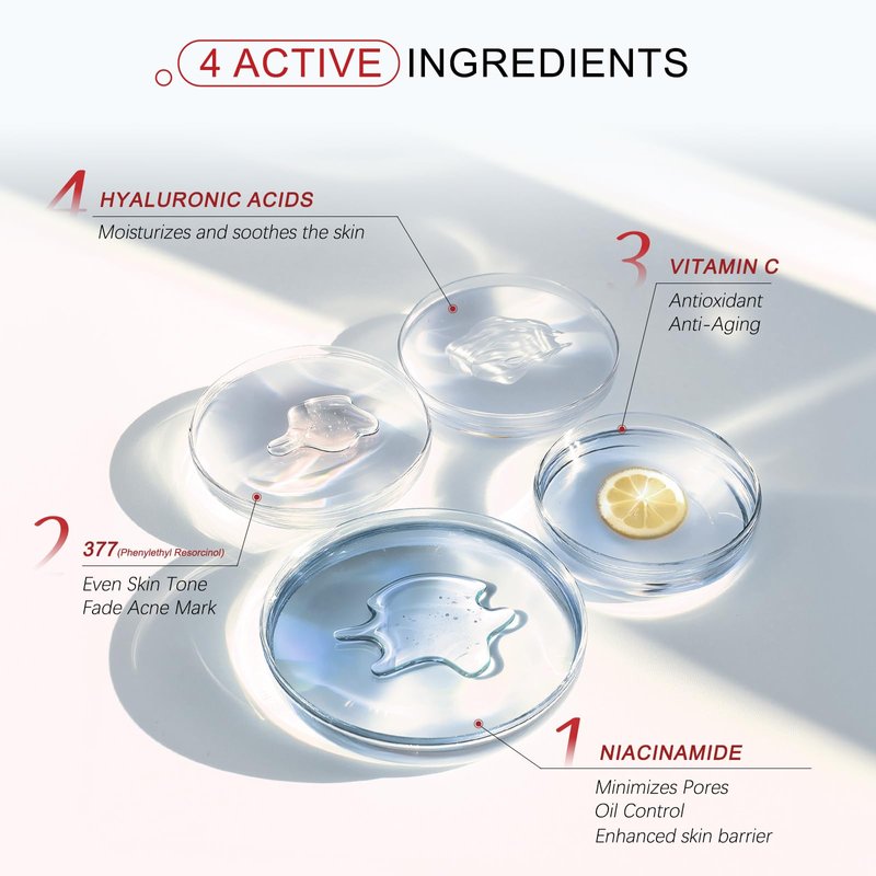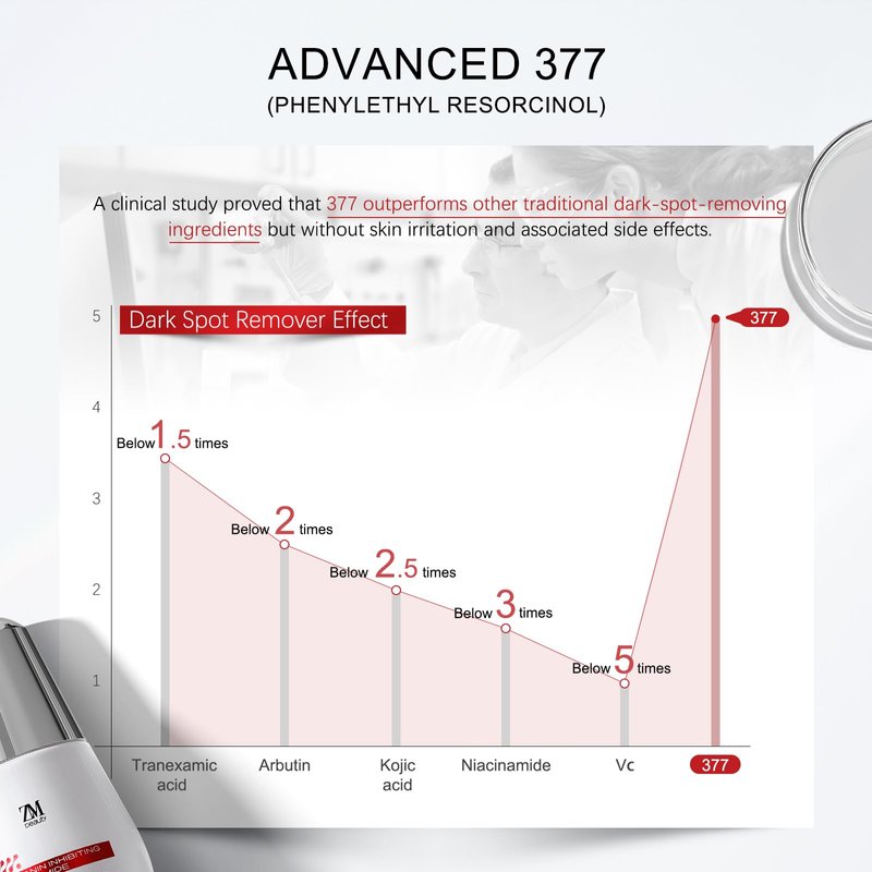 - 377 (Phenylethyl Resorcinol): After testing, 377 proves to be more effective than traditional dark spot corrector treatments, such as Tranexamic Acid, Arbutin, etc. By inhibiting the activity of tyrosinase—essential for melanin production—1% 377 effectively reduces melanin levels. It combats dullness, old acne marks, and dark spots, leaving your skin looking radiant and revitalized.