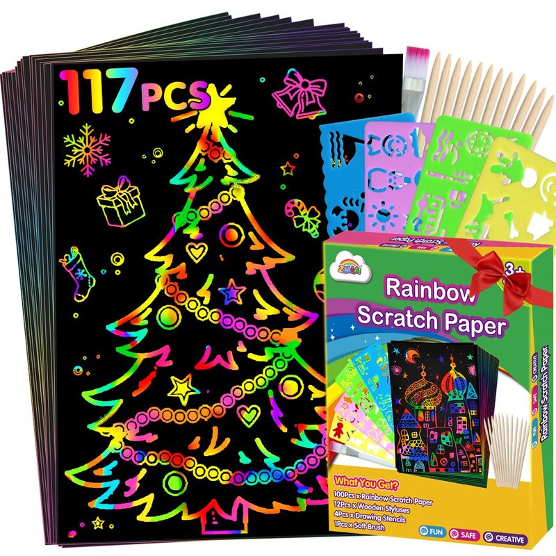 ZMLM Rainbow Scratch Paper Kit: 117Pcs Magic Art Craft Stuff Supplies Black Drawing Pad for Age 3-12 Kids Children Girl Boy DIY Toy Activity Educational|Party Faver|Christmas Birthday Gifts