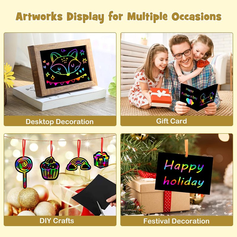 - Easy to Use & Clean: Simply use the styluses to scratch away the black surface film, revealing the beautiful rainbow colors; The configured soft brush can effectively erase the little powder on the black surface to make the artwork tidy, so your kid can enjoy the art activities happily