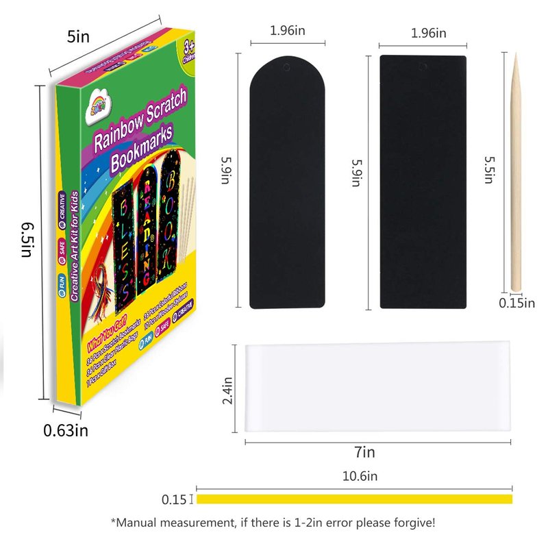 - Kids DIY Bookmarks Size: the length and width of magic scratch bookmarks are 15cm / 5.9 inches, 5cm/1.96 inches, and the length of ribbon is 20cm/7.9 inches; the length of scratch wood sticks is 14cm/5.5 inches; the bookmark gifts box is 16.5 x 13 cm/6.5 x 5 inch, large enough to hold these items inside