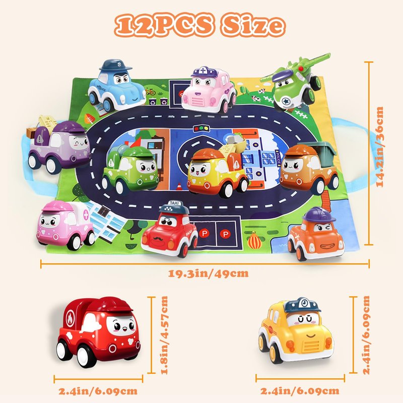 - Baby Pull Back Cars Set: Babies can get 12 pack mini cars, a 2 in 1 play mat and storage bag can be folded, well built and well engineered, colorful and cute appearance. Differen car shapes, cute expressions, cartoon drawings better arouse kid's curiosity and give children a happy world. Toddlers ages 12-18 months will be crazy to have a variety of vivid cute cars!