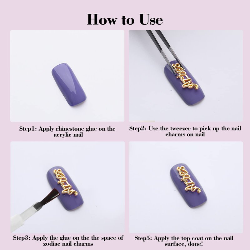 - HOW TO USE: use the glue to stick the twelve constellation charms for acrylic nails on the nail or other projects, let it dry, then apply an even and thin layer of topcoat all over the 12 constellations zodiac charms to hold the gold and silver zodiac nail art charm in place.