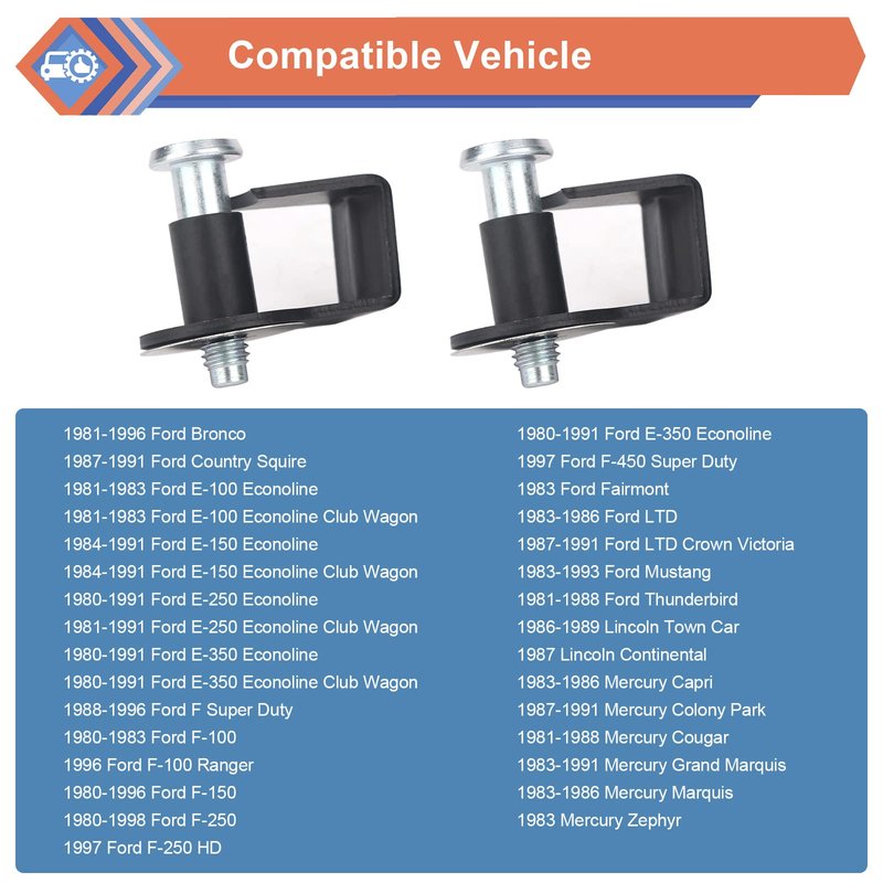 - 【Compatible Vehicle】- This door striker bolts compatible with 1981-1996 Ford Bronco, 1987-1991 Ford Country Squire, 1981-1983 Ford E-100 Econoline, 1981-1983 Ford E-100 Econoline Club Wagon, 1984-1991 Ford E-150 Econoline, 1980-1991 Ford E-250 Econoline, 1980-1991 Ford E-350 Econoline, 1980-1991 Ford E-350 Econoline Club Wagon, 1988-1996 Ford F Super Duty, 1980-1983 Ford F-100, 1980-1996 Ford F-150, 1980-1998 Ford F-250, 1980-1997 Ford F-350, 1983-1986 Ford LTD, 1987-1991 Ford LTD Crown Victoria, 1981-1988 Ford Thunderbird, 1986-1989 Lincoln Town Car, 1983-1986 Mercury Capri, 1987-1991 Mercury Colony Park, 1981-1988 Mercury Cougar, 1983-1991 Mercury Grand Marquis, 1983-1986 Mercury Marquis.