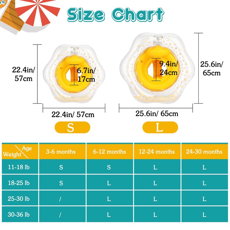 - 🏊♀️【Suitable Crowd】Recommended for ages 3-12 months old,weight 10-25 lbs (size S); ages 6-30 months old, weight 10-36 lbs (size L), Or you can contact us, we will recommend the size for your baby.
