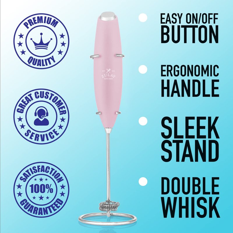 Zulay Kitchen Powerful Double Whisk Milk Frother Handheld - Foam Maker With Stand - Whisk Drink Mixer for Coffee, Mini Foamer for Latte, Matcha, Frappe, Hot Chocolate & Cappuccino - Pink