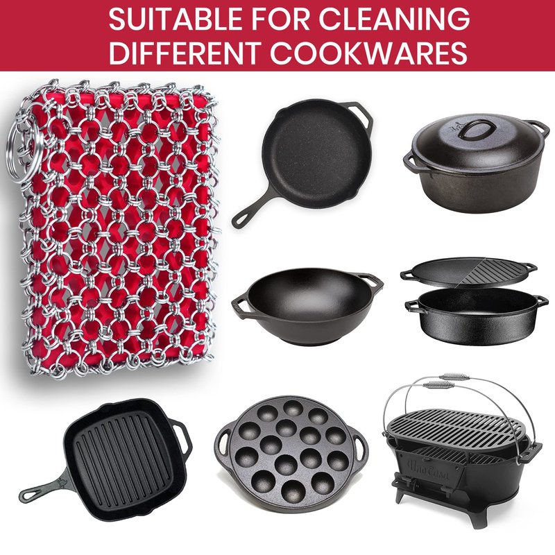 - 💎 Efficient & Effective - Cleaning cast iron cookware requires a lot of effort but would not meet the desired results without the right cast iron cleaning kit. For this deed use our chain mail scrubber for cast iron, and your cookware will be good as new afterward